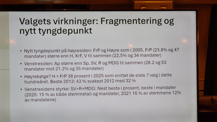 Han viste også til forskjellende mellom valget lokalt i Oppland og Lillehammer og landet totalt, hvor f.eks. Ap + SP hadde 2/3 av alle stemmer fram til 1980, mot at nå er dette redusert til 1/2.
